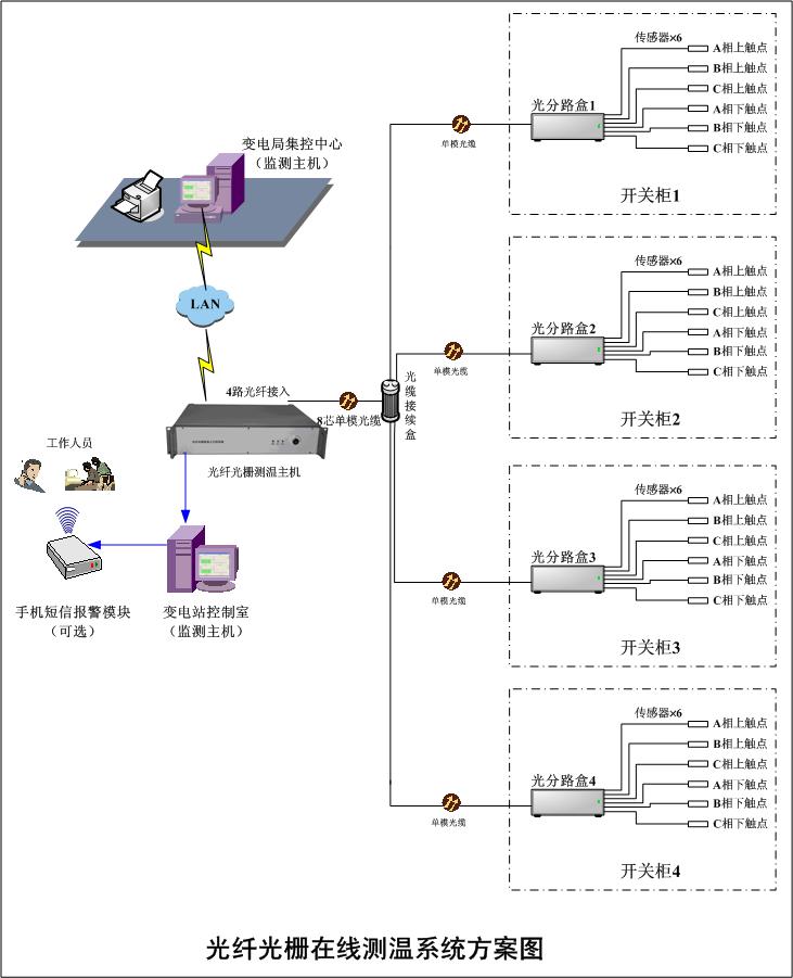 光纖光柵傳感器使用導熱硅膠直接安裝在開關柜內各閘刀、觸點位置。測溫主機為16通道,每通道最多可對12點進行溫度監測,如果每個變電站需監測觸點數量小于192使用1臺測溫主機可以覆蓋整個變電站所有開關柜。測溫主機的輸出信號送到上位機進行集中顯示和報警輸出,并可以送到火災報警控制器進行告警和消防聯動。如果要在遠端集中監控所有測溫主機,每個測溫主機端要增加遠程通信模塊,方便遠程進行集中監控。