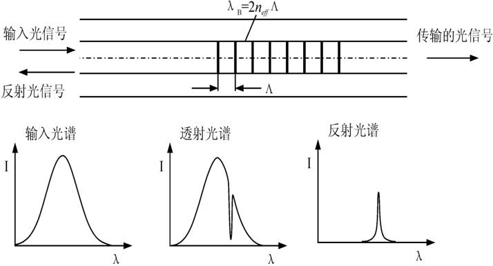 光柵是光纖經過特殊的加工處理以改變其折射率,使其只對特定的波長進行反射。這樣,一個寬譜的入射光經過光纖光柵后,只有滿足波長匹配條件的極小譜寬的光信號被反射,其余波長的光信號透射進入下一個光纖光柵。當環境溫度變化時,光纖光柵的反射光中心波長會隨之改變(溫度越高,波長偏移量越大)。通過對待測光柵的反射光中心波長進行數字化精確測量,即可獲得該光柵位置的環境溫度,如圖1所示。