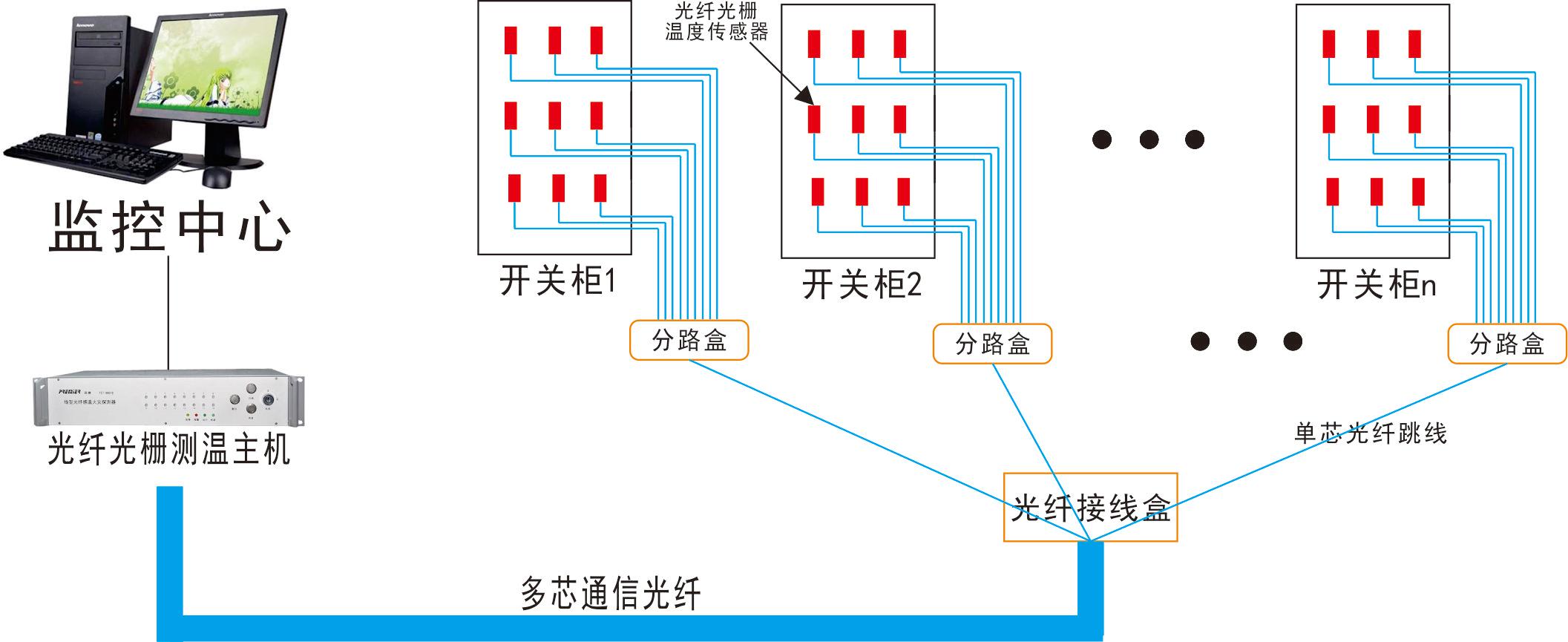 高壓電氣設備光纖光柵溫度在線監測系統主要由光纖光柵解調儀和光纖光柵傳感器組成。通過多路光纜,將傳感器連接起來構成電氣設備溫度監測網絡,通過以太網連接設備將光柵解調儀、上位機等構成溫度監測預警管理系統,并可實現系統互聯,溫度數據實時共享的功能。監測裝置的終端設在各變電所高壓電纜沿線接頭等重要部位、高壓電纜頭等需要監測的地方。