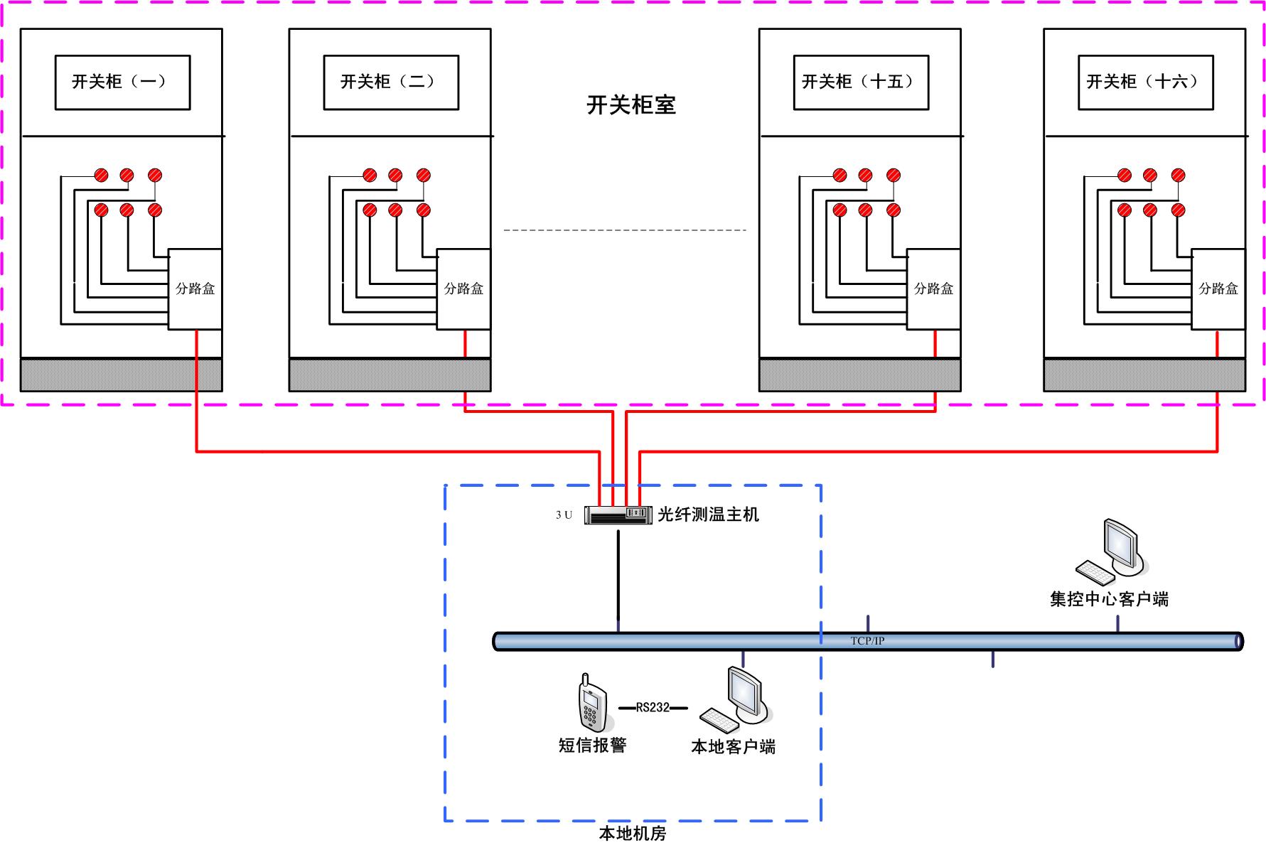 開關(guān)柜測溫系統(tǒng)開關(guān)柜是變電站的關(guān)鍵設(shè)備,其內(nèi)部開關(guān)觸頭完成電力調(diào)度的執(zhí)行工作。開關(guān)柜觸頭由于負(fù)載過大、觸頭老化、觸頭接觸不正等原因,會導(dǎo)致觸頭溫度升高,溫度過高容易引起火災(zāi),引起電力供應(yīng)故障、電力中斷和人員財產(chǎn)損失。變電站現(xiàn)有的測溫方式,主要是手持紅外測溫儀來測溫,每天定時到各開關(guān)柜巡檢,獲得開關(guān)柜的溫度狀態(tài)信息。各變電站迫切需要一種在線測溫技術(shù),實時自動采集各觸頭溫度,在溫度過高之前及時、準(zhǔn)確的監(jiān)測溫度變化并發(fā)出預(yù)警,使管理者有充分的時間采取相應(yīng)的措施,避免發(fā)生停電事故和火災(zāi)發(fā)生。